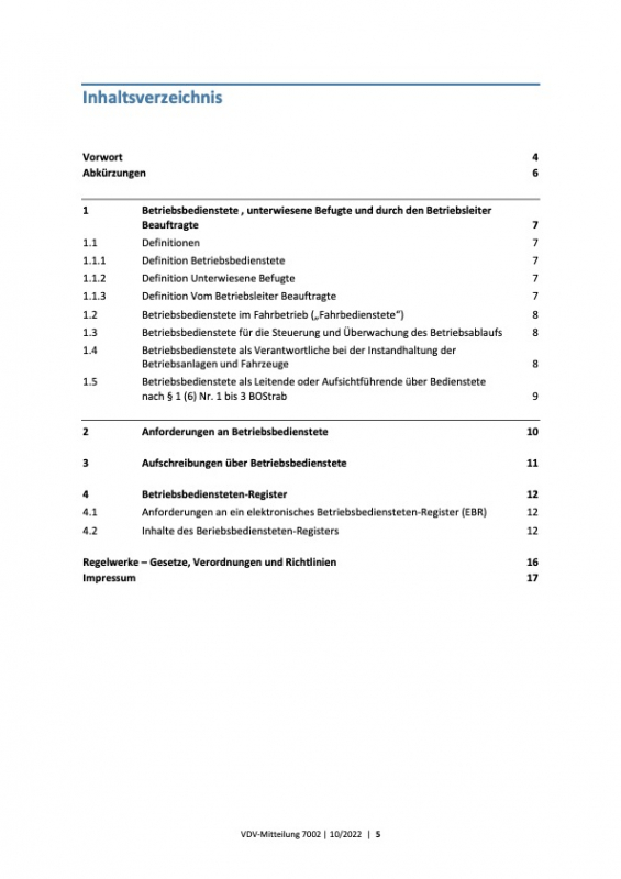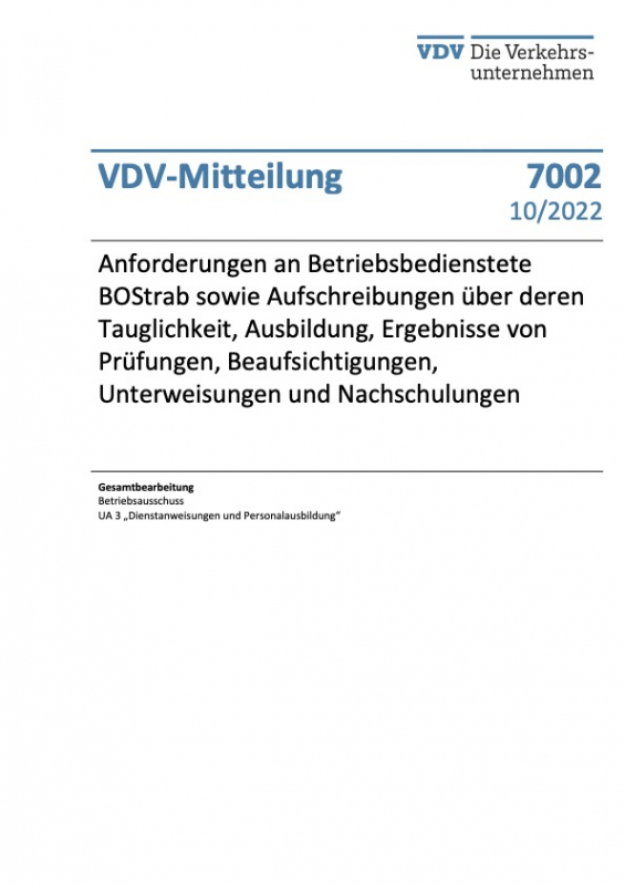 Eine erste Veröffentlichung aller gesetzlichen Anforderungen hatte der Betriebsausschuss im Jahr 1995 mit der VDV-Mitteilung 7002 "Erforderliche Aufschreibungen über Tauglichkeit, Ausbildung, Ergebnisse von Prüfungen usw. entsprechend § 10 (5) BOStrab" herausgegeben. Im Jahr 2008 wurde die VDV-Mitteilung überarbeitet und ergänzt.