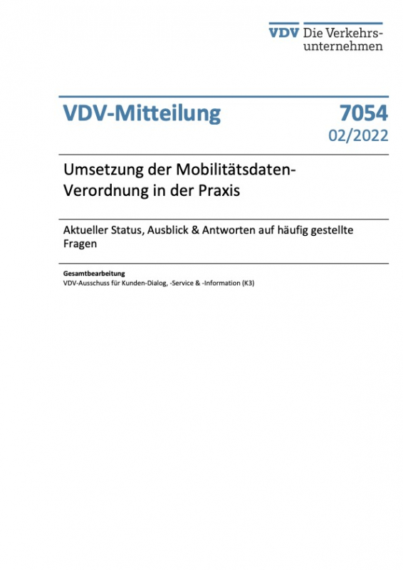 VDV-Mitteilung 7054 „Umsetzung der Mobilitätsdaten-Verordnung in der Praxis - Aktueller Status, Ausblick & Antworten auf häufig gestellte Fragen“ [Print]