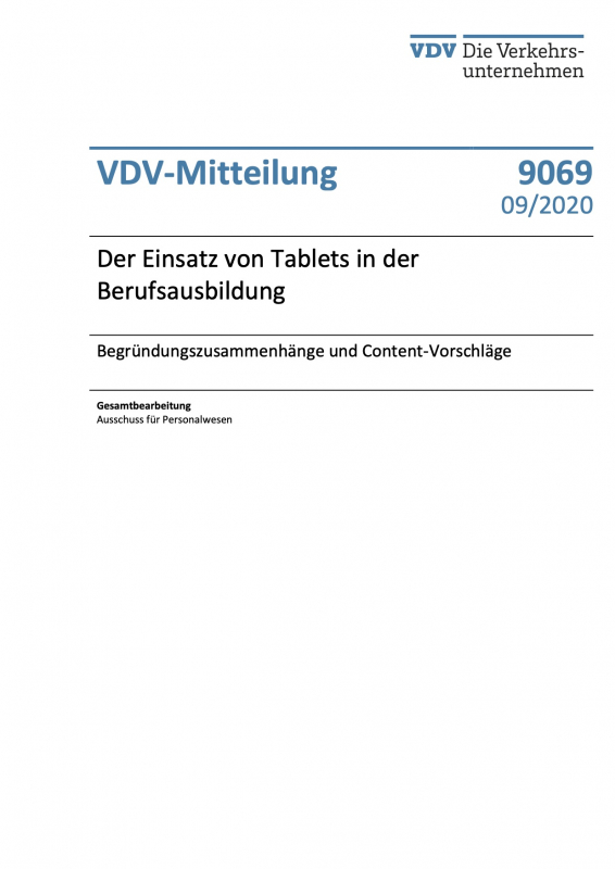 Die vorliegende VDV-Mitteilung hat zum Ziel, die Unternehmen der Verkehrs- und Mobiltitäsbranche zum Einsatz von Tablets in der Berufsausbildung zu motivieren. Sie stellt ihr Plädoyer in den Zusammenhang eines erfolgreichen Lernens in digitalen Arbeitswelten, liefert nachhaltige Argumente für digitale Lernwerkzeuge und präsentiert sinnhafte Inhalte für eine inhaltliche Erstausstattung von Tablets. Verschiedene Praxisbeispiele und Erfahrungsberichte runden diese Mitteilung ab.