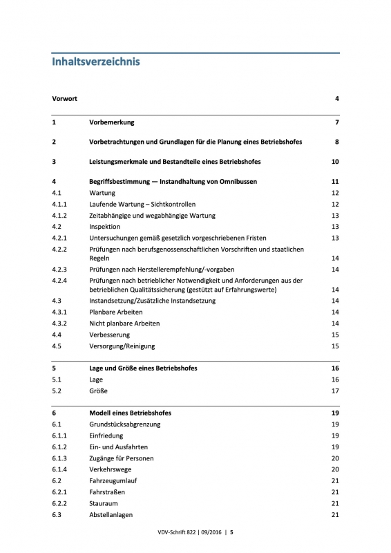 Die VDV-Schrift 822 „Richtlinie für den Bau von Omnibus-Betriebshöfen“ aus der Reihe Technik wurde 1997 fertiggestellt. In den vergangenen Jahren haben sich die technischen Gegebenheiten an den Fahrzeugen und die darauf abgestimmten Instandhaltungsverfahren so durchgreifend geändert, dass eine Überarbeitung dieser Richtlinie geboten war. Zudem verlangen die begrenzten finanziellen Mittel auch zukünftig äußerst sparsame Konzeptionen bei Neu- und Umbauten sowie wirtschaftliche Funktionsabläufe bei der Fahrzeuginstandhaltung. Auch haben sich die Anforderungen an die Betriebshöfe, bezogen auf die Erfüllung von Umweltschutzauflagen, verschärft.